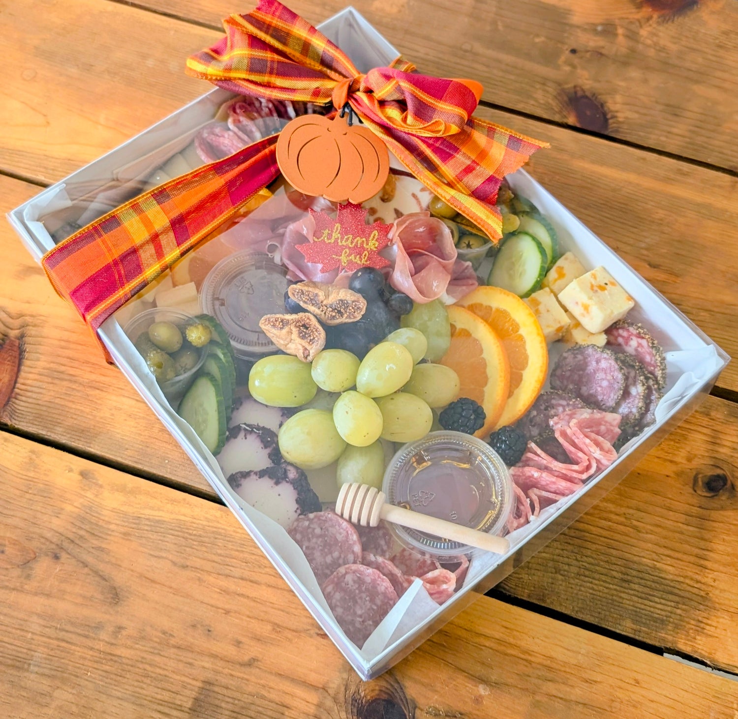 Featuring our Autumn Brie, House Pumpkin Butter, honey with honey dipper, Imported Manchego, your choice of Blueberry Vanilla Chevre or our House Honey Sesame Chevre, three types of seasonal cheese, proscuitto di parma, hard genoa salami, hard pepper salami, genoa salami, dried fig, seedless grapes, orange slices, cucumbers, green olives, gherkins, chocolate covered pretzels complete with "Thankful" leaf decal, fall-inspired ribbon & wooden pumpkin.